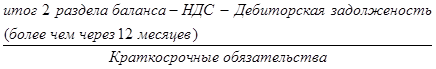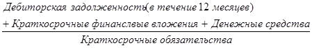 Коэффициент промежуточного покрытия - отношение денежных средств, краткосрочных финансовых вложений и краткосрочной дебиторской задолженности, платежи по которой ожидаются в течение 12 месяцев после отчетной даты, к сумме краткосрочных финансовых обязательств.