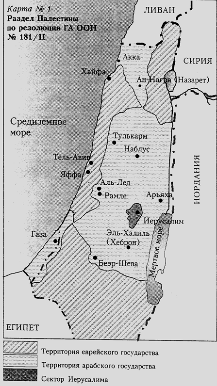 На эти предложения арабы ответили решительным отказом, сионисты воспринята их с большим реализмом. Они согласились с правом на создание еврейского государства на части территории Палестины, которое впервые было признано организацией, выступавшей в тот момент источником норм международной жизни. Доклад UNSCOP обсуждался на Генеральной Ассамблее 29 ноября 1947 г. и был одобрен 33 голосами (включая голоса Соединенных Штатов, Советского Союза и Франции), при 13 голосах против (голосах арабских государств, Индии и Греции) и 10 воздержавшихся (среди которых — Великобритания). В конечном счете после долгих прений Генеральная Ассамблея ООН приняла резолюцию 181 (II) о прекращении действия мандата и разделе страны на два самостоятельных демократических государства — арабское и еврейское. Учитывая, что проблема святых мест Иерусалима на протяжении десятилетий являлась дополнительным источником конфликта в Палестине, а также религиозное значение Святого города для христиан всего мира, резолюция предусматривала выделение Иерусалима и его окрестностей в специальную зону под международным контролем[9]