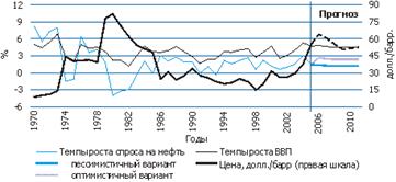 Згідно з прогнозом СВФ (квітень 2006 р.) темпи зростання світової економіки в 2006–2011 рр. складуть в середньому не більше 4.7% за рік — це достатньо високий показник. Лише при зростанні світової економіки менш ніж на 3% в рік збільшення попиту на нафту не перевищувало 1%. У зв'язку із зниженням статистичної залежності між цими показниками можна прогнозувати, що збільшення попиту на нафту в середньостроковій перспективі знаходитиметься в діапазоні 1.2–2.7% в рік. На думку експертів, з урахуванням розвитку енергозбережних технологій реальні показники зростання будуть ближчі до нижньої межі цього діапазону.