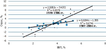 Про ослаблення взаємозв'язку між економічним зростанням і попитом на нафту говорять статистичні показники. Наприклад, в період 1970–1986 рр., коли котирування сирої нафти в реальному виразі перевищували 40 долл./барр. (у цінах 2004 р.), досягаючи в окремі роки рівня 80 долл./барр., темпи зростання світової економіки пояснювали більше 80% підвищення попиту на нафту. При цьому 4%-ний приріст ВВП збільшував нафтовий попит на 10%. Така висока залежність економіки від спросового чинника певною мірою пояснювала різке збільшення цін в цей період. В умовах ринкової економіки виробники використовували будь-які можливості для розвитку енергозбережних технологій. В результаті за останніх майже двадцять років коефіцієнт еластичності в лінійній залежності знизився з 2.5 до значення менше 1, пояснюючи при цьому менше 70% всіх коливань попиту.