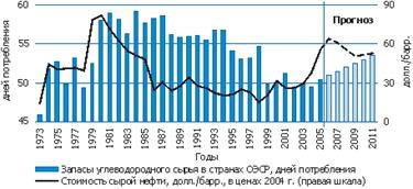 Запаси палива в розвинених странах–членах ОЕСР в 1998 р. досягли рекордного рівня — більше 4 млрд. барр., і саме в цей період ціни на нафту опустилися до мінімального рівня за попередніх чверть століття. Перевиробництво нафти на тлі різкого скорочення темпів зростання попиту на неї привело до збільшення запасів в країнах ОЕСР до 55 днів добового споживання нафти. Проте потім через низку обставин цей показник дещо знизився, і в останні вісім років рівень таких запасів коливається біля відмітки 50 днів споживання. Здавалося б, зниження незначне, але саме воно могло послужити первинним імпульсом до зростання нафтових цін до деякого рівноважного діапазону, який був визнаний странами–членами ОПЕК як цільовий (22–28 долл./барр. "опековской корзини"). І саме це було передвісником формування сильного підвищувального тренда на нафтовому ринку під впливом нових чинників, що підсилювали свою дію на кумулятивній основі. [ 4 ]