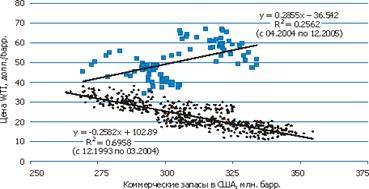 Останніми роками зростання цін на сиру нафту формувалося вже на тлі очікування виникнення її дефіциту на ринку у зв'язку з наслідками скорочення нафтовидобутку в Іраку, оскільки швидкого відновлення нафтовидобутку в цьому регіоні не відбулося. З квітня 2004 р. лінійна залежність, при якій із зростанням комерційних запасів в США (див. малюнок 3.5) спостерігалося зниження цін, почала мінятися. Політична нестабільність у ряді регіонів здобичі нафти (Персидській затоці, Венесуелі, Нігерії), стихійні лиха на південному побережжі США — одному з основних нафтовидобувних районів — не дозволяли розраховувати, що збільшення здобичі нафти само по собі зможе понизити ціни на неї. Центр уваги учасників нафтового ринку почав поступово зміщуватися спочатку у бік об'ємів резервних потужностей нафтовидобутку країнами ОПЕК, а потім і вільних потужностей нафтопереробки в найбільш розвинених країнах.