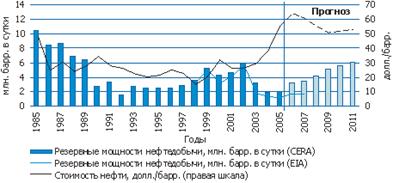 Резервні можливості по збільшенню нафтовидобутку, сконцентровані в странах–членах ОПЕК на нафту, поки відстають від попиту, що росте, і на ліквідацію даної диспропорції буде потрібно тривалий час. При цьому значна частка в наявних резервних потужностях доводиться на Саудівську Аравію: наприклад, при існуючому рівні нафтовидобутку в 9.5 млн. барр. у добу ця країна в змозі збільшити видобуток нафти до 11.3 млн. барр. на добу. Відповідно до довгострокового плану Саудівська Аравія має намір інвестувати 50 млрд. дол. в збільшення до 2009 р. виробничих потужностей до 12.5 млн. барр. у добу. Як дозволяє судити наявна інформація про поточну розробку нових родовищ і про плановані проекти, ОПЕК чекає, що в період з 2006-го по 2010 р. її виробничі потужності виростуть на 3.5–4 млн. барр. у добу. У число ключових проектів в цей період входитимуть проекти в Лівії, Нігерії, Саудівській Аравії, Індонезії, ОАЕ і Ірані. [ 8 ]