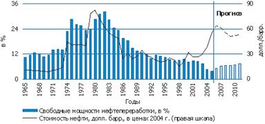 Відставання розвитку нафтопереробки від попиту, що росте, на паливо є основною причиною підвищення в даний час цін на нафтовому ринку. Згідно останньому річному огляду світових ринків енергоносіїв, підготовленому компанією BP, у 2004 р. об'єм вільних потужностей нафтопереробки перевищив об'єм споживання нафти не більше ніж на 5%, що стало мінімальним рівнем з 1965 р.. Очевидно, минулого року ситуація навряд чи істотно змінилася в кращу сторону. Згідно з розрахунками експертів, лише 8%-ный запас вільних потужностей в нафтопереробці здатний змінити ситуацію і істотно понизити ціни на сиру нафту. Для цього необхідно додатково збільшити потужності НПЗ в порівнянні з 2005 р. на 5 млн. барр. у добу, що в найближчі декілька років нереально. Проте навіть наявність вільних потужностей нафтопереробки не захищає від різкого зростання цін у разі нафтового ембарго або вимушеного скорочення постачань нафті з Персидської затоки через крупні військові дії в цьому регіоні.