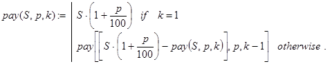с некоторым вспомогательным натуральным аргументом k. Ясно, что при обращении к ней с любыми значениями S, p и W (S×p/100<W) и k=1 получим решение исходной задачи. Обратите внимание на отсутствие отложенных вычислений при реализации number1(S,p,W,k).