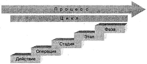 С другой стороны, если процесс характеризуется отрезком времени, на протяжении которого он осуществляется, то и любое его деление на составные части приводит к представлению ряда обособленных отрезков, границы которых определяются критериями разделения. Они могут быть достаточно разнообразны, но всегда существенны с позиций организации построения, осуществления и развития собственно процесса. Именно эти составляющие, критерии их выделения, процедуры установления связей между ними, последовательность их объединения и формируют наши представления о внутренней организации любого процесса.