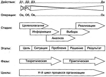 Покажем основные конструктивные элементы представления процесса организации. Это позволяет отразить их в данной главе вполне определенной последовательностью характерных шагов организации любого процесса следующим образом (рис.3).