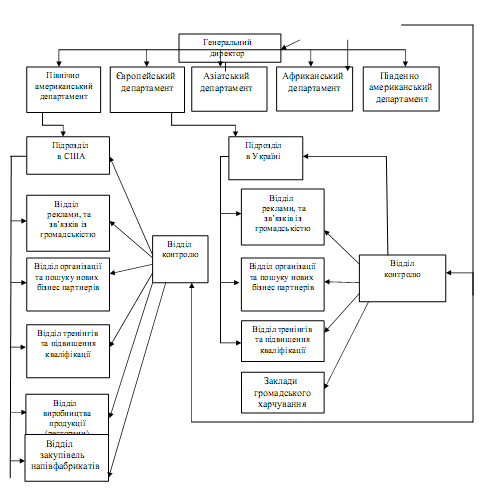 Отже, як видно із даного рисунку, компанія “МакДональдз” має чітку ієрархічну структуру підрозділів. На вершині ієрархії – збори аукціонерів, тому, що компанія є акціонерною. Для безпосереднього управління компанією існує генеральний директор, який несе відповідальність перед зборами акціонерів також він безпосередньо здійснює управління усіма департаментами компанії. Відповідно кожний департамент створений на основі географічної ознаки та має своє представництво у кожній із країн регіону, який він представляє. Так компанія “МакДональдз” реалізує свою продукцію або через франчайзинг або безпосередньо своїми закладами, відповідно структурні підрозділи деяких країн є різні. Як приклад представлено Україну та США. Також існує відділ контролю, який підпорядковується Зборам акціонерів, ат має свої окремі структурні підрозділи для контролю міжнародних департаментів та представництв у кожній із країн.