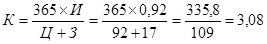 де И – коефіцієнт, що враховує час використання тари; Ц – середня тривалість технологічного циклу, дні; З – мінімальний запас виноматеріалів, дні. У цьому показнику всі змінні величини змінюються в залежності від рівня організації виробництва. На винзаводі, И = 0,92. Щоб прискорити оборотність виробничої тари, варто збільшити час її використання протягом року, а для цього потрібно скорочувати терміни ремонту тари, підвищувати якість ремонту, використовувати тару з прогресивних матеріалів, зі стійкими внутрішніми покриттями, прискорювати заповнення тари. Усе це скоротить терміни готовності виробничої тари під чергове заповнення. В ВАТ «Ударний», Ц = 92 днів, тому що тривалість технологічного циклу деяких вироблюваних вин власного купажу досить тривала. На швидкість оборотності виробничої тари впливає тривалість технологічного циклу. Середня тривалість технологічного циклу залежить від ряду факторів, у тому числі від якості виноматеріалів, що надходять, від їхньої розливостійкості. У цьому відношенні повинне поліпшуватися якість вироблюваних виноматеріалів. Скороченню технологічного циклу на винзаводі буде сприяти також підвищення рівня механізації й автоматизації основного виробництва, заміна дрібних ємностей на великі для збереження виноматеріалів, підвищення безперервності процесів виробництва, скорочення термінів обробки виноматеріалів і виготовлення купажів. Мінімальний поточний запас виноматеріалів на винзаводі складає 17 днів (З). Він залежить від ряду специфічних особливостей: умов підготовки до сезону переробки сировини на заводах первинного виноробства, наявності вільних ємностей; умов збереження виноматеріалів на винзаводі (облік кліматичної зони й ін.). Таким чином, коефіцієнт оборотності тари має значення: