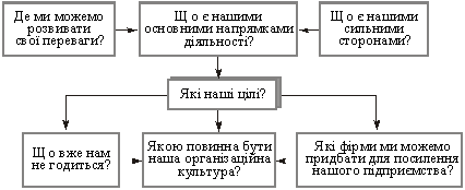 цілі, завдання, стратегії (особливо функціональні), "стратегічний набір" організації;