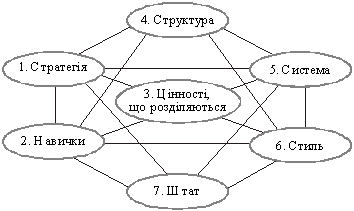 Цінності, що розділяються, пов’язані з явищем організаційної культури, є "цементуючим елементом" колективу підприємства, що сприяє (чи протидіє) змінам і розвитку підприємства. Розвиток, перспектива можуть бути однією з цінностей організації, яка допомагає виживанню та успіху організації. Ця складова моделі "7S-Mak-Kiнci" за своєю сутністю є тим середовищем, атмосферою, де відбуваються дії по перебудові підприємства відповідно до прийнятої стратегії. Цінності, що розділяються, впливають на оцінки, зміст і темпи перетворень, а також на всі елементи моделі, що розглядається.