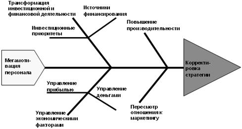 Данный аспект общей программы трансформации деятельности компании в условиях кризиса изображен на схеме рис. 1 в виде хвоста рыбы. Как известно, с помощью своего хвоста рыба увеличивает скорость своего движения. Именно такой смысл имеет мегамотивационная система. Все перечисленные выше факторы перестройки деятельности компании должны начать работать очень быстро, как любят говорить многие руководители: "мне это надо сделать еще на вчера". Как же сделать, чтобы все это начало работать как можно раньше? Принципиальный ответ прост: надо поставить персонал компании в условия, когда он сам будет заинтересован или вынужден это делать. Вспоминается фрагмент фильма "Особенности национальной охоты", когда перевозили корову в бомболюке самолета. Ее не удалось выбросить из бомболюка. Тогда командир очень образно выразился: "жить захочешь — не так раскорячишься".