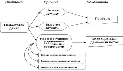 Управление экономическими факторами. Главное проявление кризиса, от которого страдает бизнес, — это нехватка денег. На рис. 2 представлена схема, объясняющая причины и проявление недостатка денег.