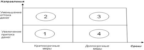 Что же делать, чтобы уменьшить дефицит денег. Прежде всего, следует не поддаваться панике и системно представить направления, по которым необходимо действовать. Система мер, представленная на рис. 4 выглядит весьма просто.