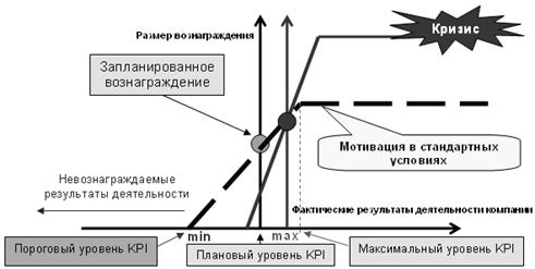 Как следует из схемы рисунка, если работник достигает запланированное значение KPI, он получает запланированное вознаграждение. Размер вознаграждения уменьшается пропорционально при снижении реально достигнутого KPI и становится нулевым, если достигнутый KPI становится меньше некоторого минимального значения (точка min на рисунке). Если реально достигнутый KPI становится выше запланированного значения, то премия увеличивается, но не беспредельно, а до какого-то числа (точка max на рисунке). Последняя особенность этого алгоритма страхует руководителя от занижения планового значения KPI. Во время кризиса вся картина смещается вправо, ставя перед работником повышенные цели и позволяя ему заработать больше. Если в такой ситуации постоянную часть заработка сделать очень маленькой, например, на уровне принятого в стране прожиточного минимума, работник вынужден будет сделать все возможное и невозможное, чтобы выжить. И это снова напоминает корову в бомболюке.