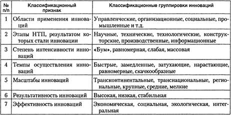 Следует остановиться на некоторых видах инноваций, различающихся по областям применения и этапам НТП: