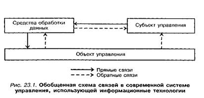 Между процессом получения и распространения информации аппарат выполняет ряд разнообразных действий. Он может: 1) преобразовать информацию (например, информацию о продажах в информацию о полученной выручке и выполненной работе); 2) объединять информацию (например, информацию о продажах с информацией о закупках в информацию о товарно-материальных запасах); 3) накапливать информацию (например, информацию о продажах для составления ежемесячных и годовых отчетов о доходах). Обобщенная схема связей в организации, использующей информационные технологии, показана на рис. 23.1.