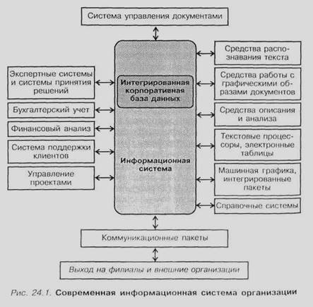Современные компании применяют информационные технологии для совершенствования методов работы. В результате изменяется организационная структура компании, разрабатываются новые организационные взаимосвязи, которые ранее экономически были невозможны. Вот почему информационные технологии являются весьма перспективной и эффективной сферой для капиталовложений. Принципиальная схема построения и взаимодействия основных элементов современной информационной системы организации приведена на рис. 24.1.