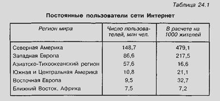 По данным 2000 г., постоянные пользователи сети Интернет распределялись по регионам мира следующим образом (табл. 24.1). По прогнозам, к 2005 г. сетью Интернет будут пользоваться во всем мире 1 млрд человек. В ближайшие четыре года пользователями Интернета в режиме оп-