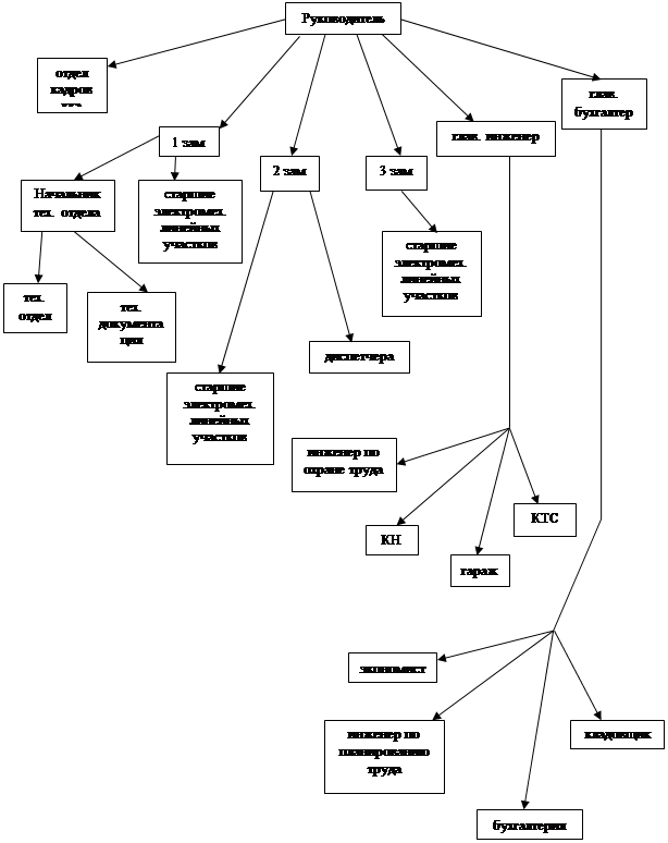 Во главе стоит руководитель. У него в подчинении находятся три заместителя, главный бухгалтер, главный инженер и отдел кадров.