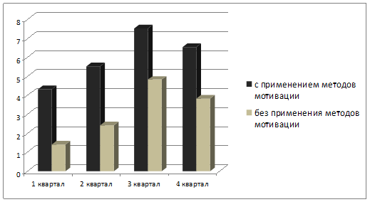 ПРИМЕЧАНИЕ: На этой диаграмме примерно представлено, как бы изменились результаты работы организации при активном применении методов мотивации, и при пассивном их применении.