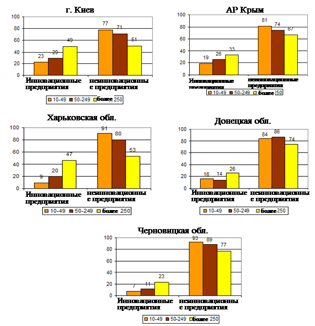 Статистическое наблюдение показало, что уровень инновационной активности среди крупных предприятий (свыше 250 лиц) составляет от 23% до 49%, среди средних (50-249 лиц) – 11-29%, среди малых предприятий (10-49 лиц) – 7-23%. Наивысший показатель – среди крупных предприятий г. Киева, самый низкий – среди малых Черновицких области.