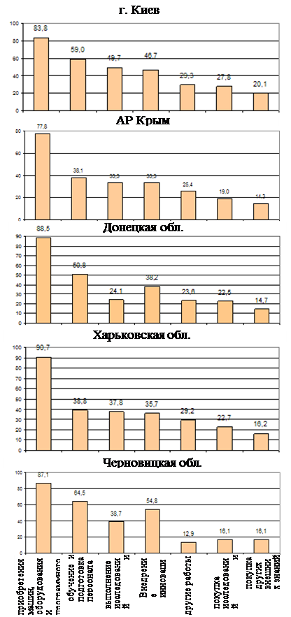 В соответствии с диаграммами, показанными на рисунке, в сегменте приобретения машин, оборудования и программного обеспечения лидирует Харьковская область (90,7%), а наименьший показатель у АР Крым (77,8%). В сфере обучения и подготовки персонала вырвалась вперёд Черновицкая область, при этом на последнем месте – также Крым. Что касается выполнения исследований и разработок, то тут лидирует город Киев – 49,7%, а наинизший показатель у Донецкой области – 24,1%. По выведению инноваций на рынок лидером является Черновицкая область, а наиболее скромные показатели также у Крыма. Покупкой исследований, разработок и других внешних знаний в основном занимаются предприятия г. Киева (27,8 и 20,1% соответственно). А в других видах инновационной деятельности является Харьковская область. Необходимо отметить, что лидерство Черновицкого региона по некоторым позициям обусловлено малой концентрацией промышленных предприятий, на которые приходится большее количество инновационных.