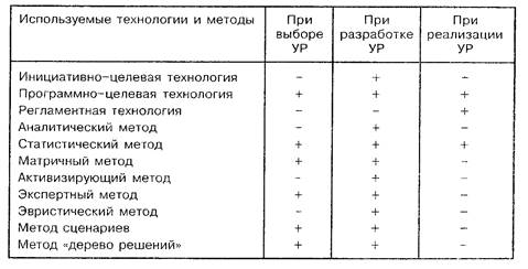 Разработка вариантов, выбор и реализация УР — также достаточно подготовленные процедуры ПРУР. Разработка и реализация УР базируются на технологиях и методах, в описании которых имеется набор условий эффективного применения. Задача состоит в выборе лучшей технологии и лучшего метода из возможных вариантов. Правильность выбора и определяет качество этих процедур. Наборы технологий и методов для стадии подготовки УР и для реализации УР немного отличаются (табл. 2).