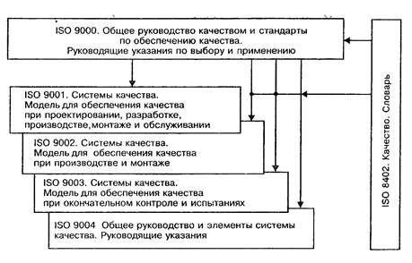 ISO 9001 предназначен для организаций, занимающихся исследованиями, разработкой продукции и ее сервисным обслуживанием, ISO 9002 — для занимающихся сервисным обслуживанием продукции, ISO 9003 —для занимающихся контролем, испытаниями и тестированием, ISO 9004 — для организаций, не связанных с контрактными поставками. Общая схема системы стандартов ISO 9000 приведена на рис. 8.