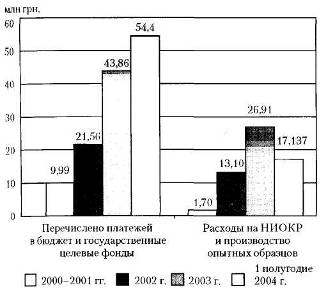 Рис. 2. Бюджетная и научная эффективность технопарков на Украине в 2000 г. – I полугодии 2004 г. (млн. грн.)