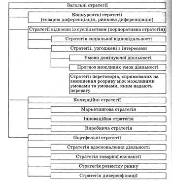 Своїм змістом стратегії підприємств відображають особливості їх функціонування, стадії розвитку, конкурентний статус тощо. Позначаються на них і особливості національної економіки, галузі, до якої вони належать, а також такі суб'єктивні чинники, як стратегічне бачення та мислення їх засновників і менеджерів. Складну і багатоманітну сукупність стратегій класифікують за такими ознаками: