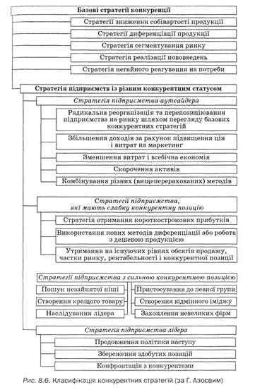Класифікація стратегій, розроблена російським вченим Геннадієм Азоєвим, ґрунтується на концепції, згідно з якою підприємства, що функціонують на певному ринковому сегменті, поділяють на підприємства-лідери, підприємства з сильною конкурентною позицією, підприємства зі слабкою конкурентною позицією та підприємства-аутсайдери (рис. 4).