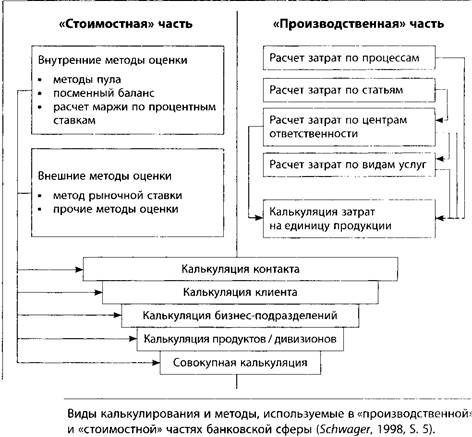Использование современных инструментов контроллинга сначала получило распространение в «стоимостной» части, однако «производственная» часть не поддержала идею использования этих инструментов. Это объясняется тем, что приоритетом номер один является сохранение доверия между банком и клиентом. Поскольку предоставление банковских услуг связано с коммерческой тайной клиента, то ценовая конкуренция между банками становится особенно актуальной. Это утверждение действительно лишь в отношении банковских продуктов, в значительной степени подверженных ценовой конкуренции. Для расчета затрат продуктов, менее подверженных влиянию ценовой конкуренции, целесообразно использование метода расчета затрат по процессам, позволяющего, например, определить нижнюю границу цены.