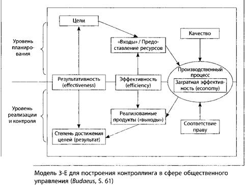 Базовая идея контроллинга хорошо реализуется в сфере управления, однако с учетом ряда специфических особенностей. Для контроллинга в сфере управления, т. е. целенаправленного планирования, управления и контроля выполнения задач общественного характера, согласно мнению экспертов, хорошо подходит так называемая «З-Е-модель» – effectiveness, efficiency, economy(Beckerи Weise; Budaeus1999, S. 55). С помощью этой модели, содержащей иерархию целей по производительности, процессам и затратам, можно проследить соблюдение интересов различных групп – например, граждан, политиков и др. (рис. 1.12). На основе поставленных управленческих целей определяются так называемые «входы» или «inputs» (ресурсы) – персонал и инфраструктура. Ресурсы в процессе создания продуктов преобразуются в так называемые «выходы» или «outputs». Примером продукта может служить проведение учебного занятия в школе. «Выходы» имеют определенные характеристики (например, способность школьников читать) и подлежат анализу со стороны руководства.