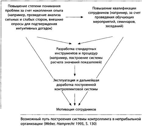 Важнейшими аспектами построения контроллинга в неприбыльных организациях следует считать: построение системы стратегического планирования, повышение степени ориентированности на клиента, а также анализ внутренних процессов. На рис. 1.14 представлена возможная схема построения контроллинга в неприбыльной организации. При внедрении контроллинга в практику этих организаций предпочтение должно отдаваться простым решениям, поскольку затраты на создание совершенной системы вряд ли окупятся и вызовут критику со стороны сотрудников.