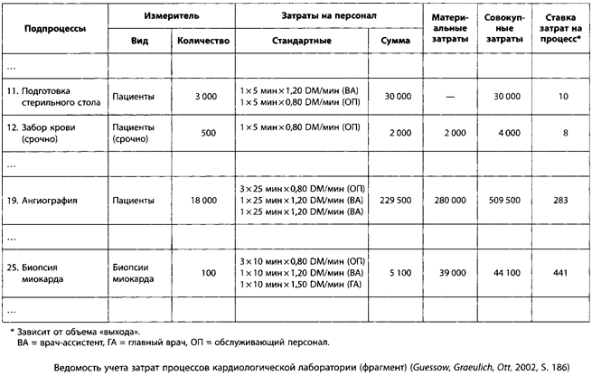 С учетом специфических особенностей сферы здравоохранения метод расчета затрат по процессам хорошо применим для построения системы учета затрат, соответствующей требованиям DRG(Guessow, Graeulich, Ott, 2002). На рис. 1.15 представлен пример использования метода расчета затрат по процессам. Этот метод позволяет добиться прозрачности процессов, достигаемых результатов и затрат в отдельных подразделениях. Такая прозрачность служит необходимой предпосылкой построения системы экономического планирования, управления и контроля в сфере здравоохранения, а также основой для переговоров здравоохранительных организаций с государственными органами.