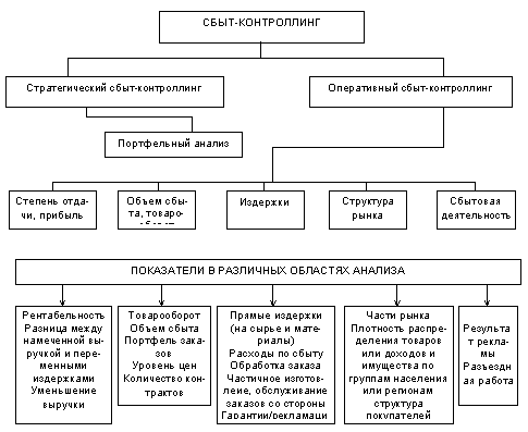 Стратегический контроллинг-сбыт обеспечивает постоянную степень отдачи, эффективность деятельности предприятия. Оперативный контроллинг-сбыт ориентирован в первую очередь на управление прибылью с помощью контроля и анализа таких факторов, как прибыль, объем сбыта и товарооборота; структура издержек; структура рынка; характеристики сбытовой деятельности.