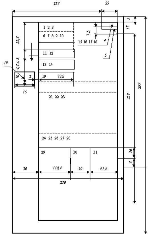 На документах реквізити повинні розташовуватися відповідно до формуляра-зразка, з дотриманням полів, встановлених ГОСТом 6.38 – 90: ліве поле – 20 мм, верхнє поле – не менше 10 мм; праве і нижнє – не менше ніж 8 мм (схематичне розташування реквізитів див. на стор. 9).