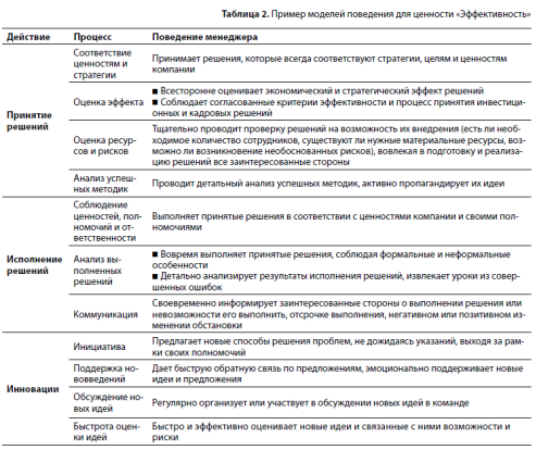 _ Уважение к людям. Компания стремится стать привлекательным работодателем, который создает своим сотрудникам безопасные условия труда, достойную оплату и дает возможность самореализации, инициативы и развития внутри организации. Проектными командами были разработаны модели поведения (табл. 2) для каждой ценности, т.е., по сути, ценности были преобразованы в действия и задачи. Это один из самых главных моментов управления по ценностям.