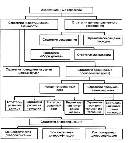 Инвестиционные стратегии — это стратегии формирования инвестиционного портфеля. С этих позиций можно выделять стратегии, направленные на развитие деятельности компании, ее рост, и стратегии, направленные на сокращение этой деятельности (рис. 1).