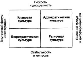 Наряду с уровнями и элементами выделены типы организационной культуры. Одна из самых популярных типологий предложена К. Камероном и Р. Куинном. В ее основу положены четыре группы критериев, определяющих стержневые ценности организации: