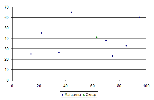 Координаты места расположения склада на обслуживаемой территории ( , ) определяются как средние арифметические координат магазинов, взвешенные по товарообороту магазинов-потребителей ( ):