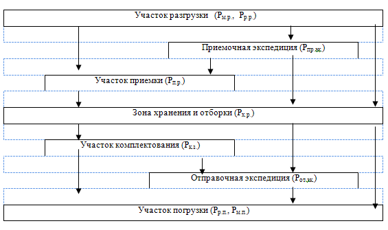 На следующем этапе весь входной поток товаров разделяется на три потока: поток товаров проходящий через приемочную экспедицию (Рпр.эк