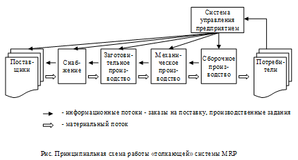 В процессе реализации этих целей система MRPобеспечивает поток плановых количеств материальных ресурсов и запасов продукции на горизонте планирования. Система MRPсначала определяет, сколько и в какие сроки необходимо произвести конечной продукции. Затем система определяет время и необходимые количества материальных ресурсов для выполнения производственного расписания.