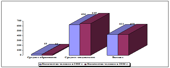 Как видно из таблицы 7 соотношение между тремя группами работников Курского почтамта по уровню образования в 2006 г. в сравнении с 2005 г. изменилось незначительно. Стоит отметить тот факт, что работники Курского почтамта, имеющие высшее образование работают не только в должностях руководителей и специалистов (52+22=74 чел.), а также и по другим рабочим специальностям. Заслуживает внимания следующий положительный факт – достаточно низкая доля от численности персонала руководящих должностей. Как отрицательный можно отметить тот факт, что профильное (услуги связи) образование имеет только одна треть работников Курского почтамта (как высшее, так и среднее специальное). Представим полученные данные в виде рисунка 4. Для характеристики движения рабочей силы рассчитывают и анализируют динамику следующих показателей: коэффициент оборота по приему персонала (КПР); коэффициент оборота по выбытию (КВ); коэффициент текучести кадров (КТК