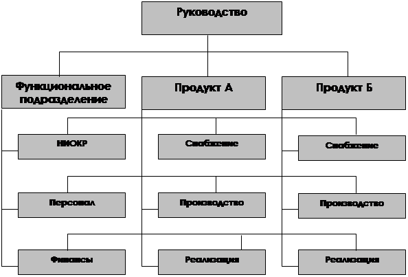 На рисунке (Приложение 1) дан пример простой матричной структуры. В предпринимательской фирме одновременно осуществляются создание и выпуск трех продуктов, за каждый из которых отвечает отдельный руководитель. Все четыре группы служащих выполняют полную цепочку функций, от создания продукта до производства и продаж.