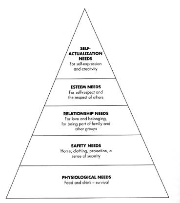 Часто для описания человеческих потребностей приводят схему-пирамиду, предложенную американским психологом Абрахамом Маслоу. Согласно его концепции мотивации, наши потребности представляют собой иерархию, то есть существуют базовые биологические и высшие потребности, потребности самореализации личности. В пирамиде Маслоу пять уровней (см. рис. 1):