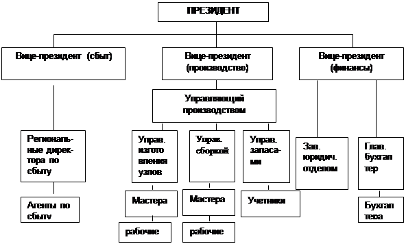 (акционерные общества). Самая простая управленческая структура включает здесь президента, вице-президента, специалиста по сбыту. Общее руководство в небольшой корпорации осуществляет совет директоров в составе, как правило, пяти человек, в том числе трех внешних директоров (ими являются банкиры, управляющие крупных фирм, юристы, которые могут хотя бы частично компенсировать недостаток опыта управляющего такой корпорации, помочь решать трудные проблемы).