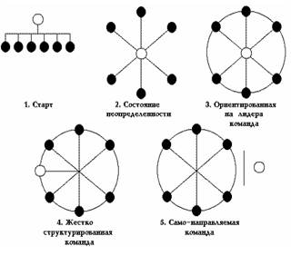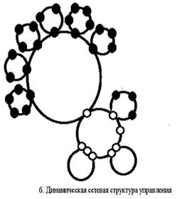Вместе с тем уже сегодня в таких фирмах, как IBM, Texas Instruments, начинают просматриваться черты нового состояния, новой стадии развития рабочих команд. Сегодня можно говорить о шестой стадии, связанной с появлением сети самонаправляемых рабочих команд, в том числе и на уровне менеджмента, и переходом к динамической сетевой структуре управления (рис.2.4.3).