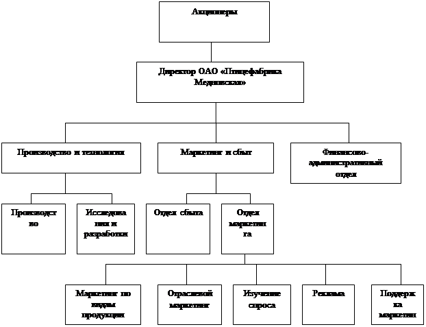 В настоящее время ОАО «Птицефабрика Медновская» не сформирован и не функционирует отдел маркетинга. Функции по сбыту продукции и выполнению заказов, то есть функции маркетинга, возложены на отдел организации производства и сбыта. В связи с этим мы предлагаю на данном предприятии создать отдел маркетинга, который находится в прямом линейном подчинении директора ОАО.
